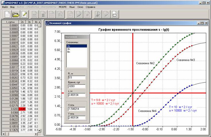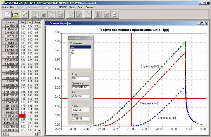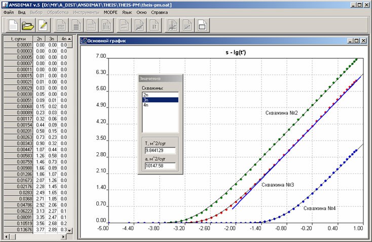 Определение параметров способом прямой линии (синяя линия) и подбора параметров (черные линии) на графике временного прослеживания от приведенного времени. Использование графика в данных координатах позволяет применять графоаналитический способ обработки. |
