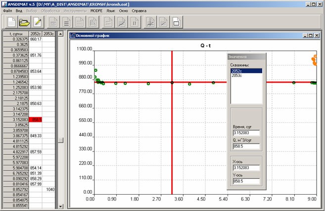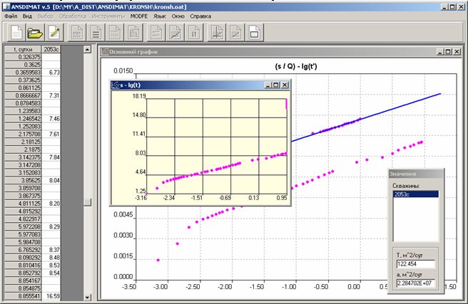 Определение параметров способом прямой линии (синяя линия) на графике временного прослеживания от приведенного времени. Использование графика в данных координатах позволяет применять графоаналитический способ обработки. |